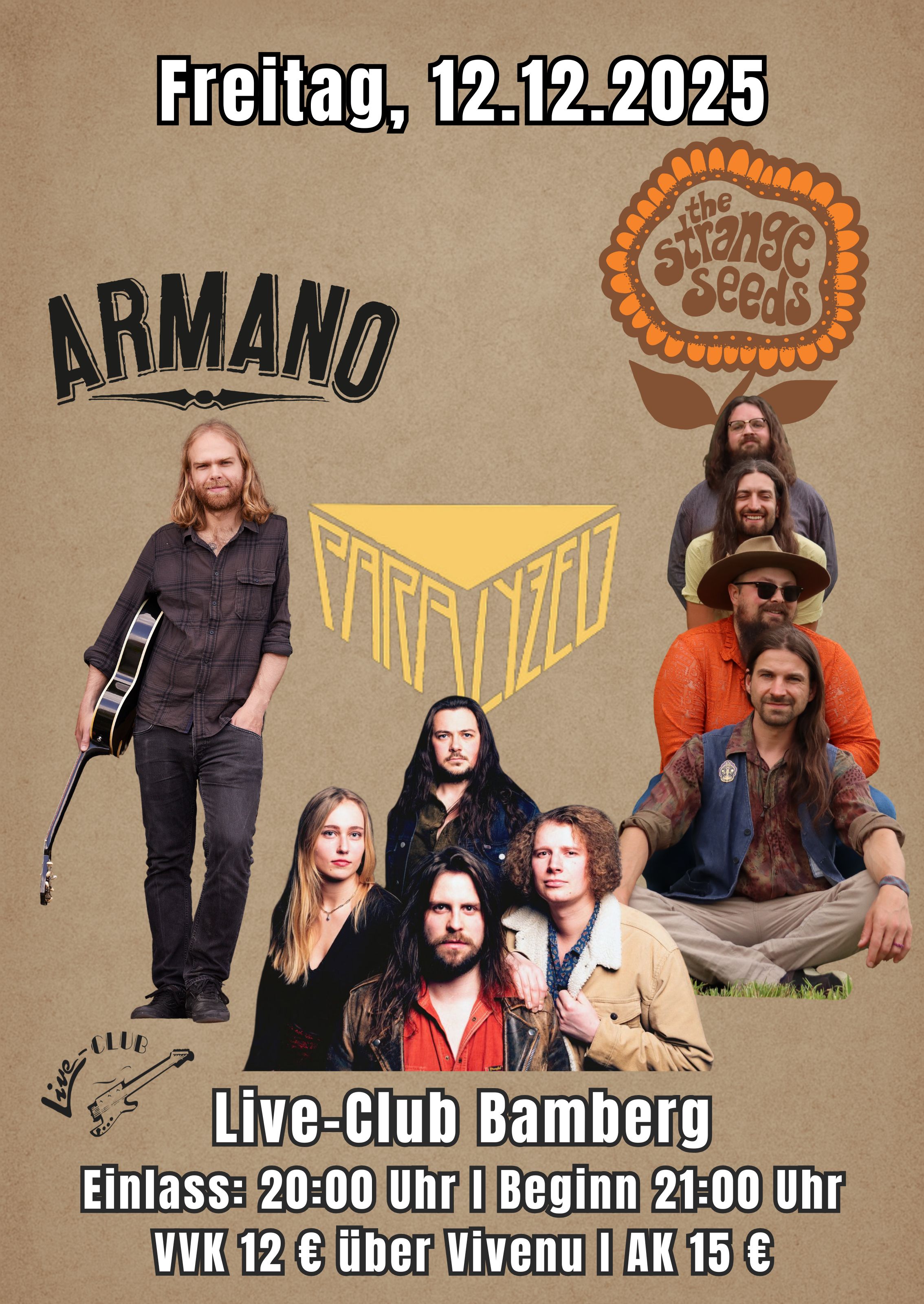 Armano & Band – Seit 2021 ist Armano, bekannt als Sänger von Oporto und The See See Riders, auch solo unterwegs. Mit seiner kraftvollen Stimme, starkem Songwriting und filigranem Fingerpicking bewegt er sich zwischen Country, Blues und Americana. Mit dem neuen Album „I Hate To Leave“ bringt er gemeinsam mit Bass und Drums den Sound des amerikanischen Südens und Mittleren Westens authentisch und voller Energie auf die Bühne.