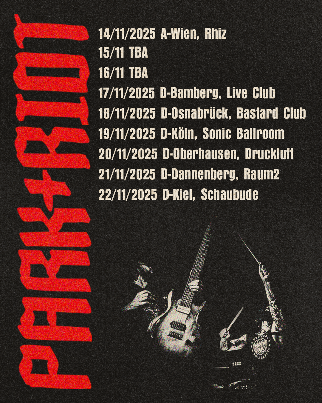 Das Duo PARK+RIOT aus Leipzig liefert eine kompromisslose Mischung aus Hardcore, Sludge und Math, die direkt ins Mark geht. Tief verwurzelt in der Underground-Punk-Szene, überzeugen sie mit roher Energie, wütender Präzision und einer unverkennbaren Live-Wucht – egal ob in besetzten Häusern, Clubs oder auf großen Festivalbühnen.